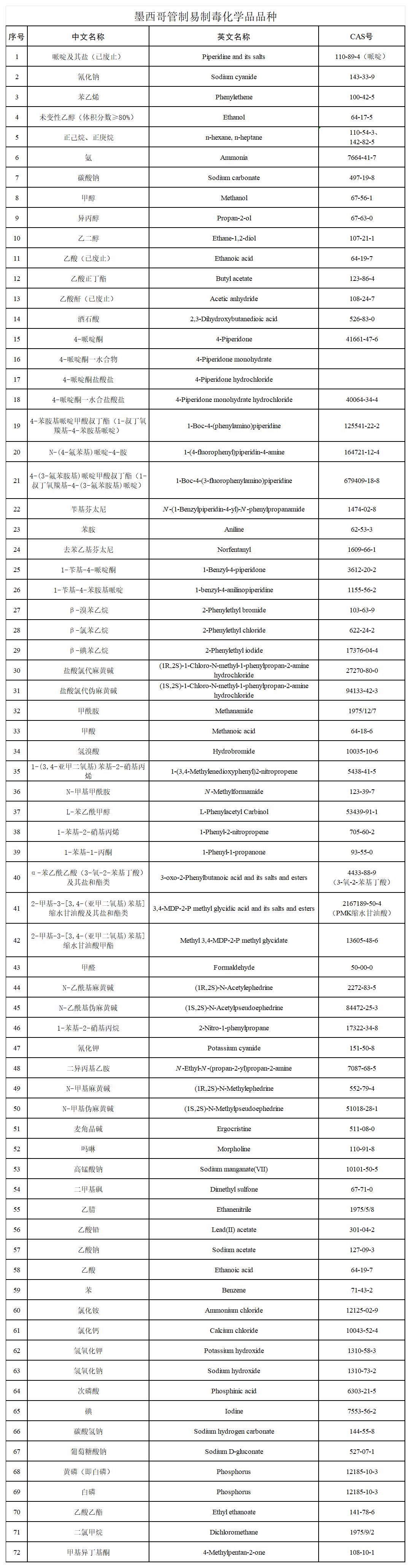 墨西哥管制易制毒化学品品种